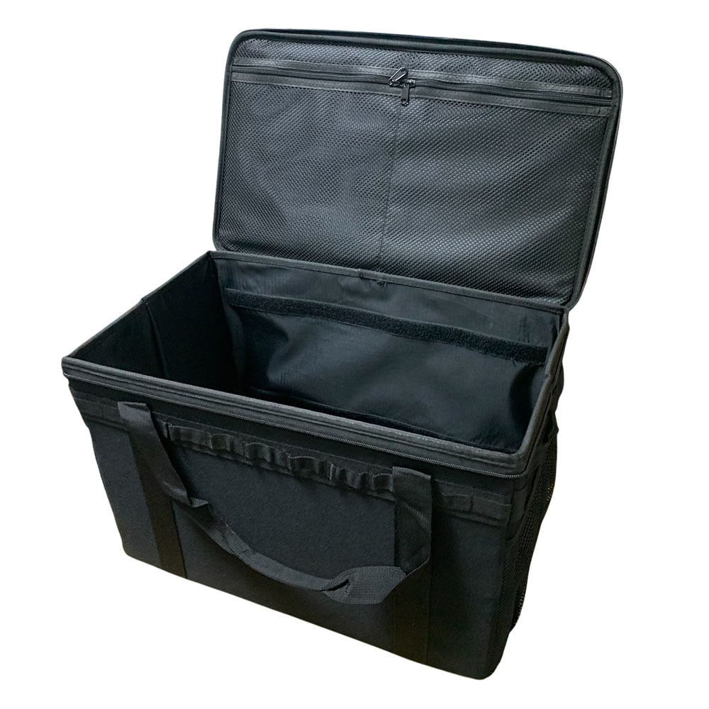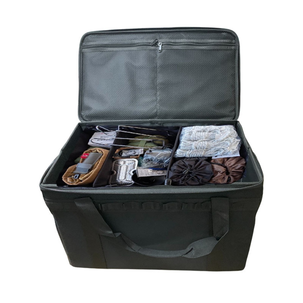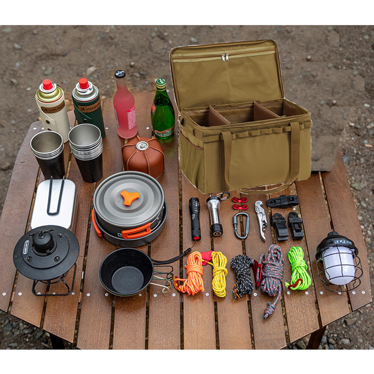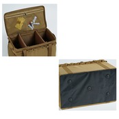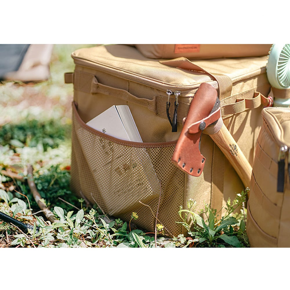 仕切り用の板を2枚付属、キッチンツールや小物を綺麗に分別することができます。焚き火台や薪ストーブなどの大きさのあるキャンプグッツ入れる際は、仕切り板を外してご使用ください。また、キャンプバッグの側面にあるカラビナループに、コップやキッチンツール・ナイフなどのキャンプ道具を掛けることができます。